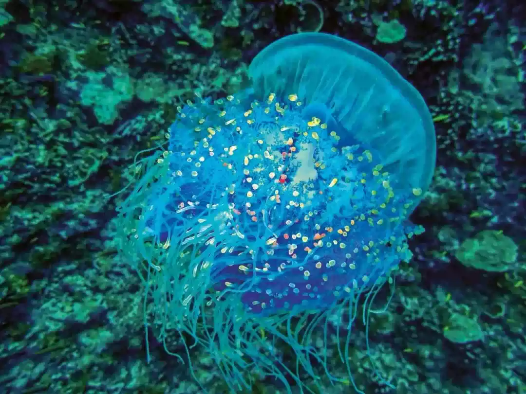 太平洋中部岛国基里巴斯南莱恩群岛周围的珊瑚礁,在经受过2016年气候暖化的摧残后,又发生了神奇的复苏,这是生活在其间的水母。