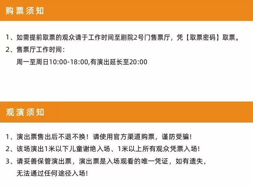 1.购买前请您提前规划好行程,做好相应准备,以免影响您的正常观演,感谢您的理解和配合。