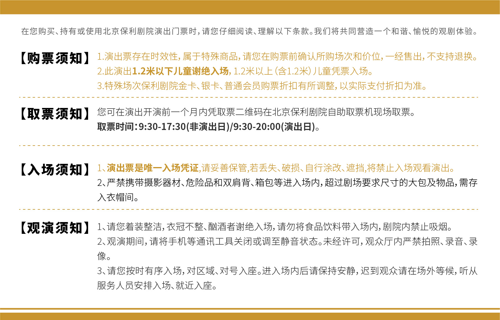 1.购买前请您提前规划好行程,做好相应准备,以免影响您的正常观演,感谢您的理解和配合。
