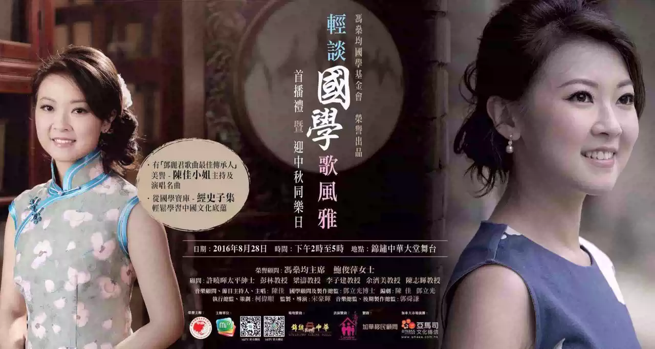 2016年起,陈佳凭借个人的文学修养和温婉高雅的书卷气质,被香港冯燊均国学基金会聘请为顾问,并在基金会推出的一系列国学节目《轻谈国学歌风雅》中担任主持人、撰稿人、音乐总监,用说与唱结合的方式传承优秀中华文化。