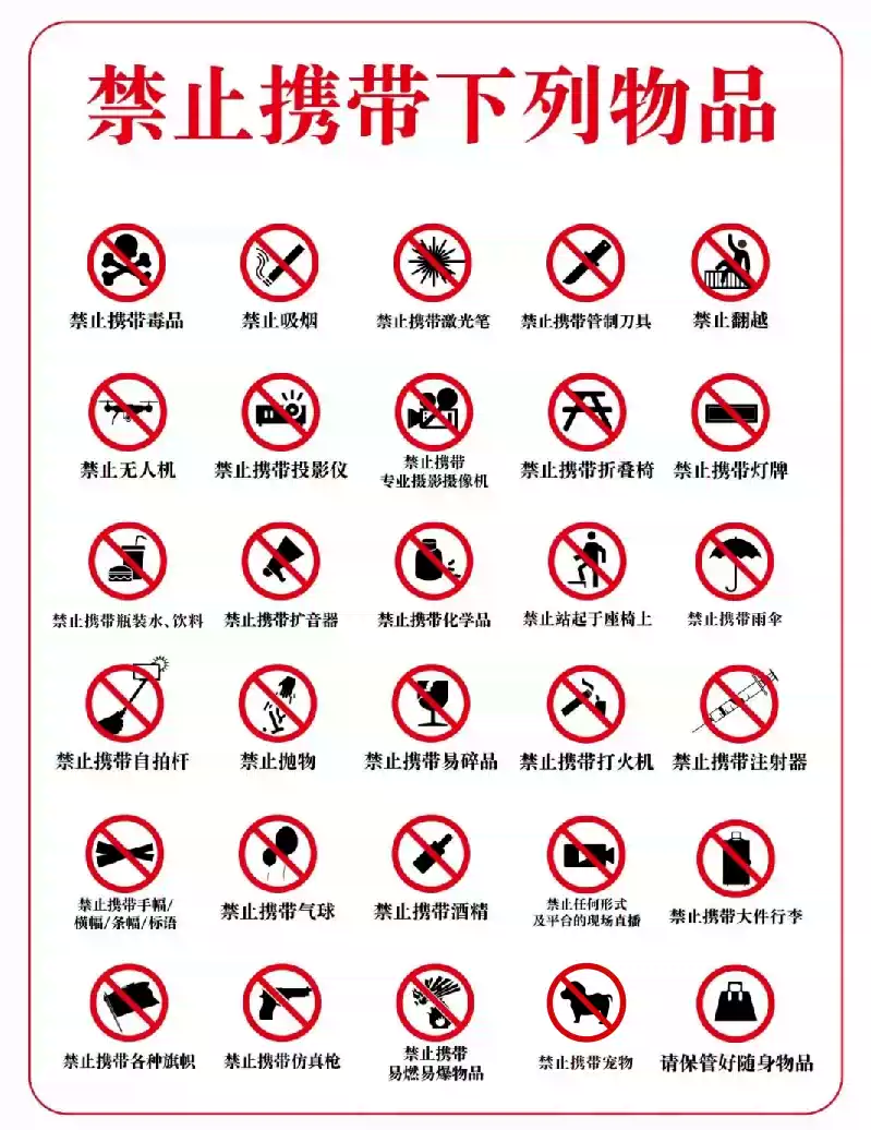 由于安保和版权的原因,大多数演出、展览及比赛场所禁止携带食品、饮料、专业摄录设备、打火机等物品,请您注意现场工作人员和广播的提示,予以配合。