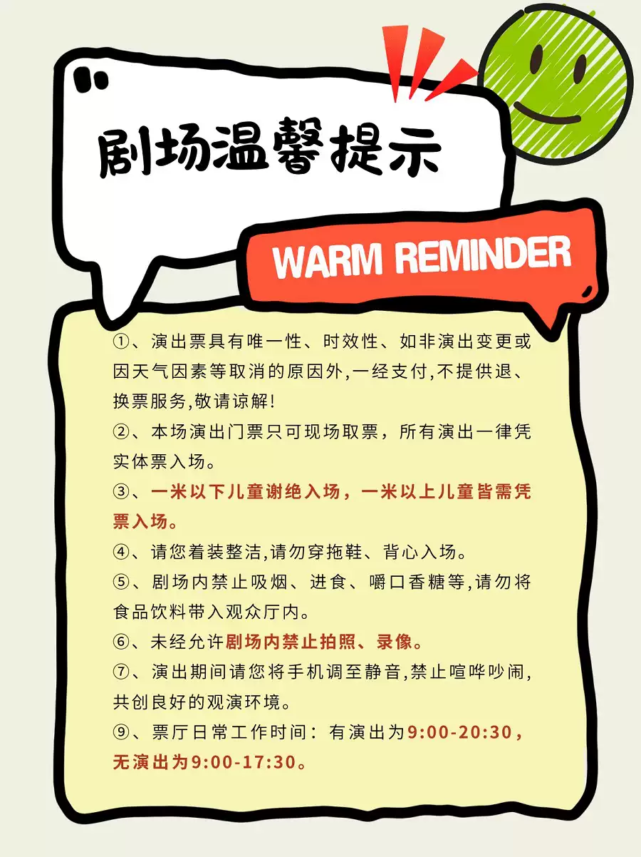 1.购买前请您提前规划好行程,做好相应准备,以免影响您的正常观演,感谢您的理解和配合。