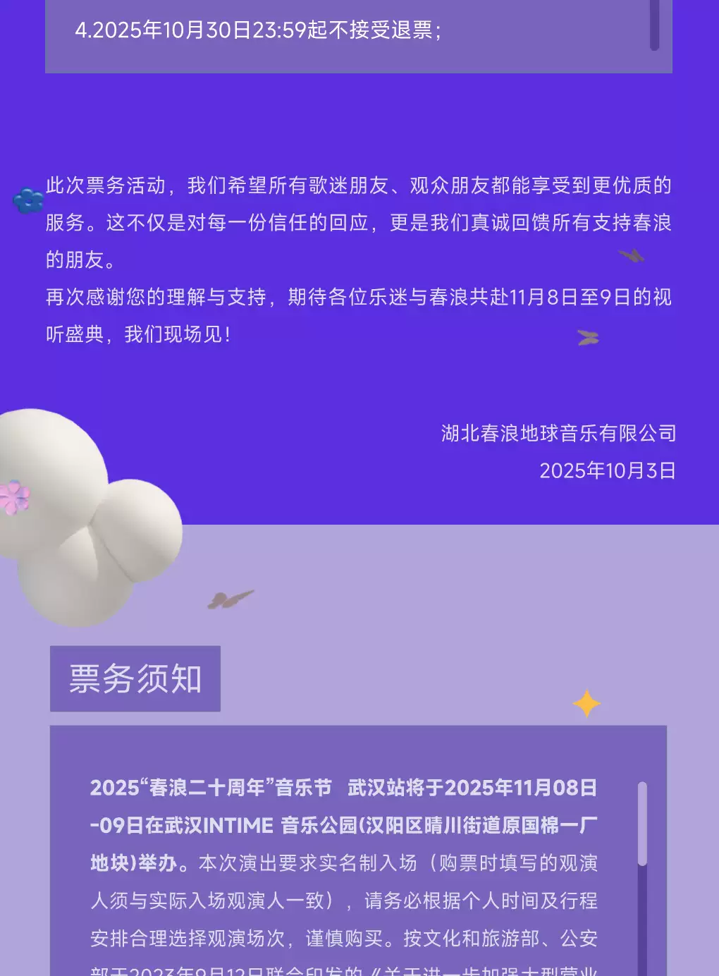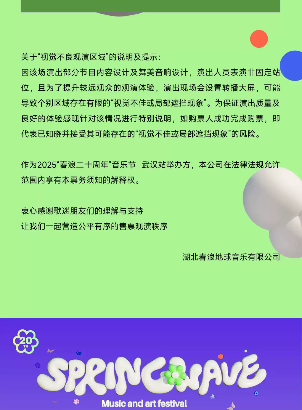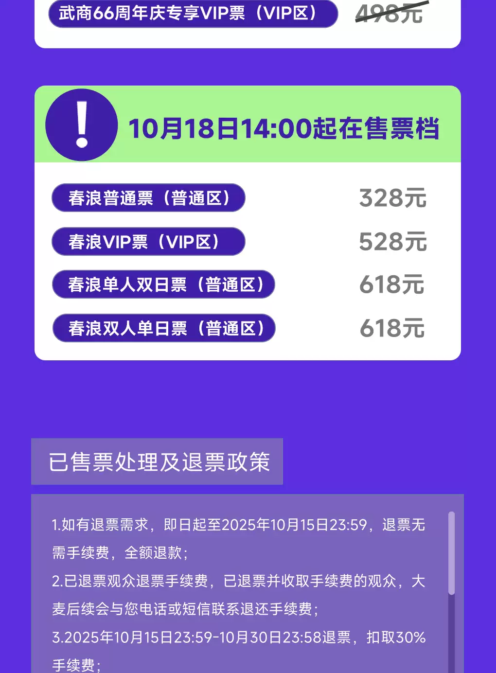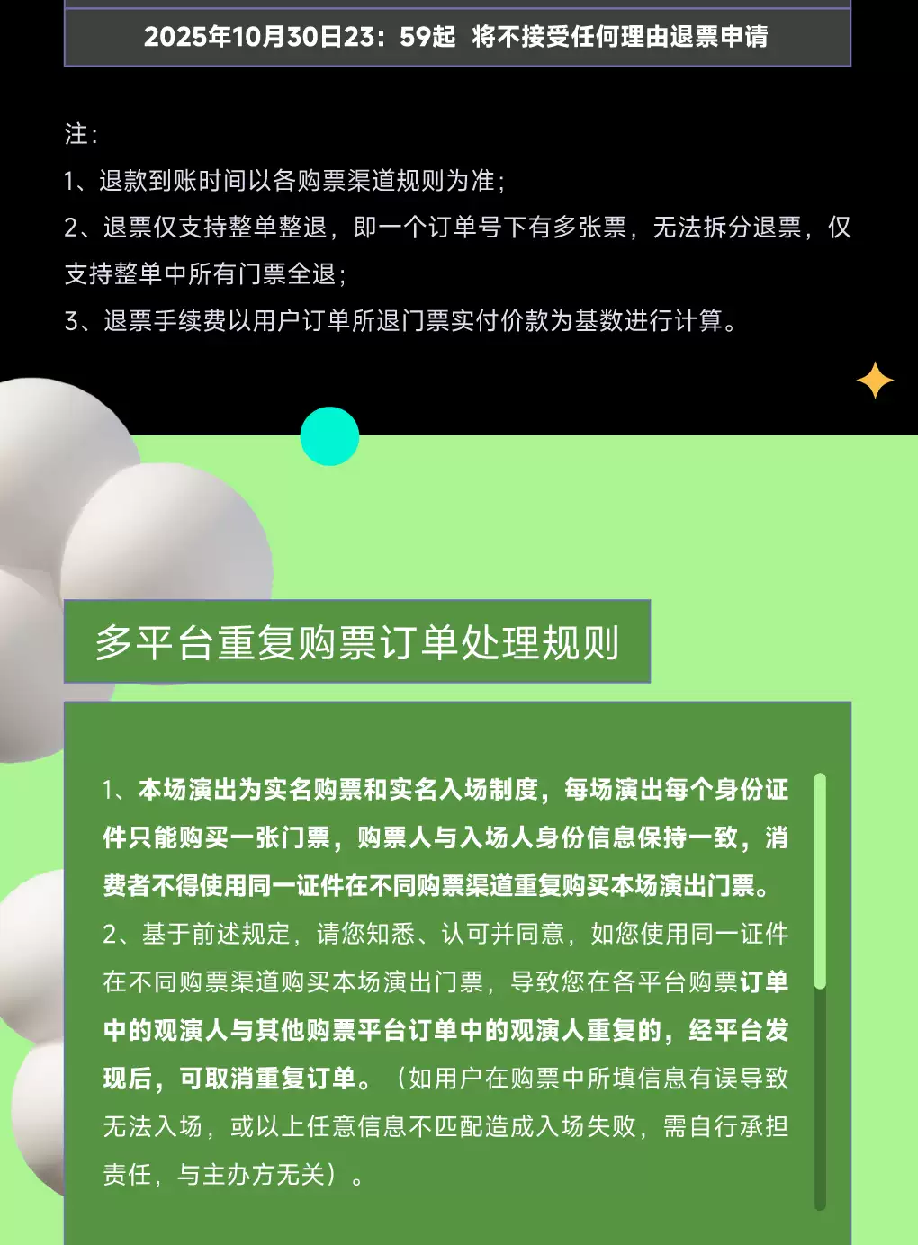 2.若演出受不可抗力影响延期或取消,本平台将对演出票订单按照项目官方通知方案进行处理,其他因观演发生的费用需由您自行承担。