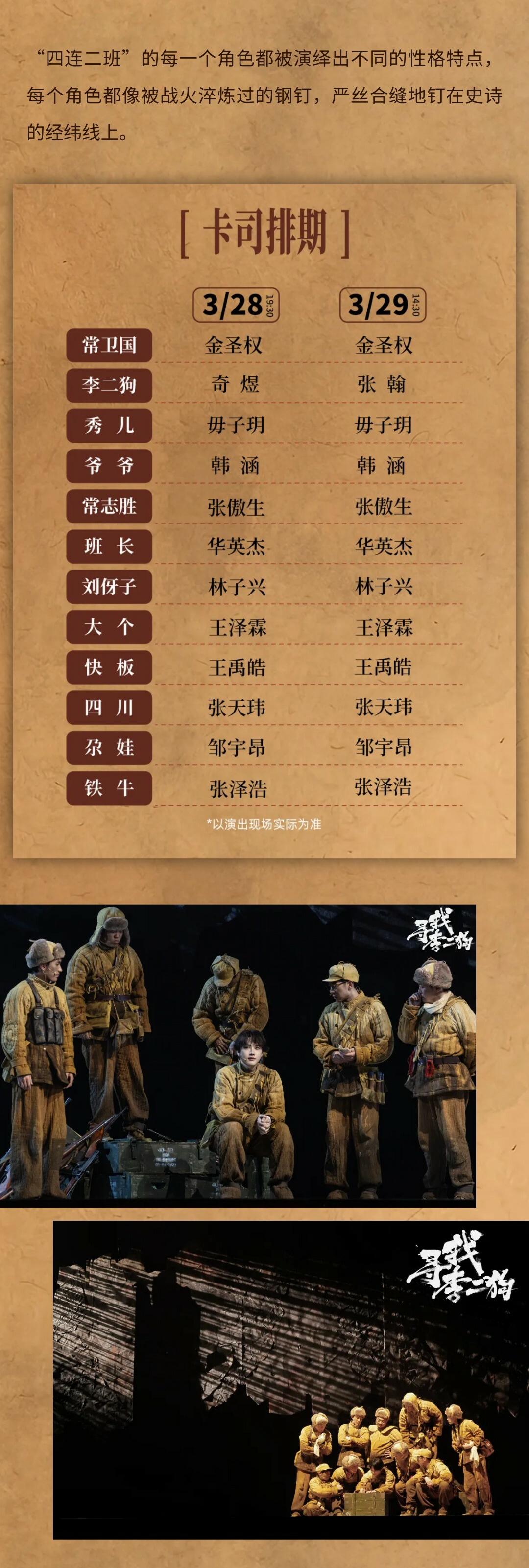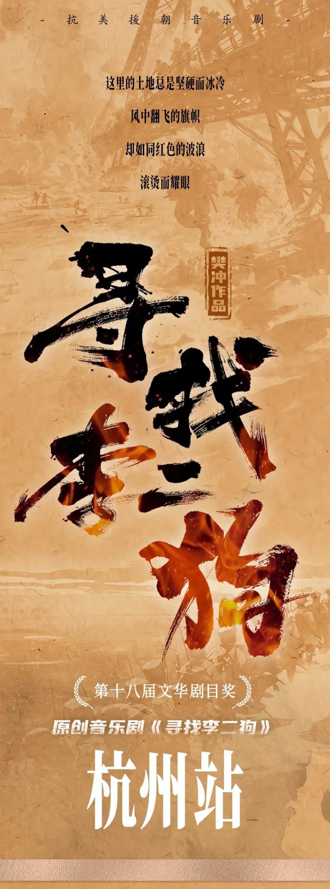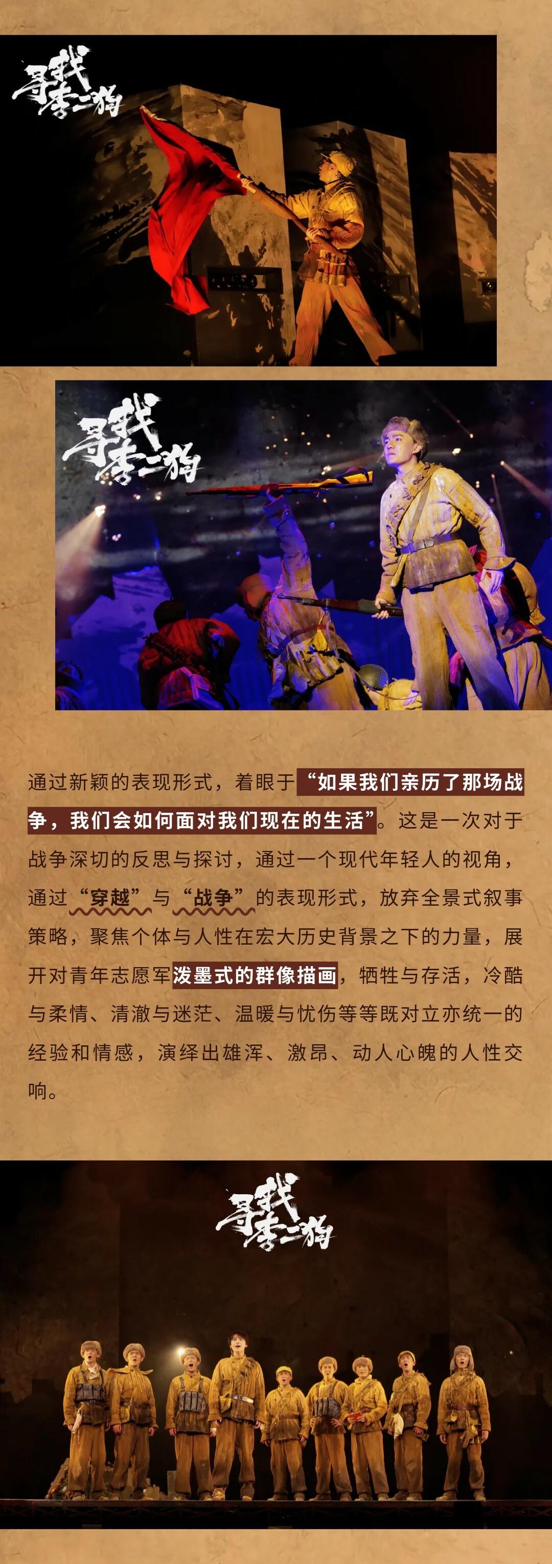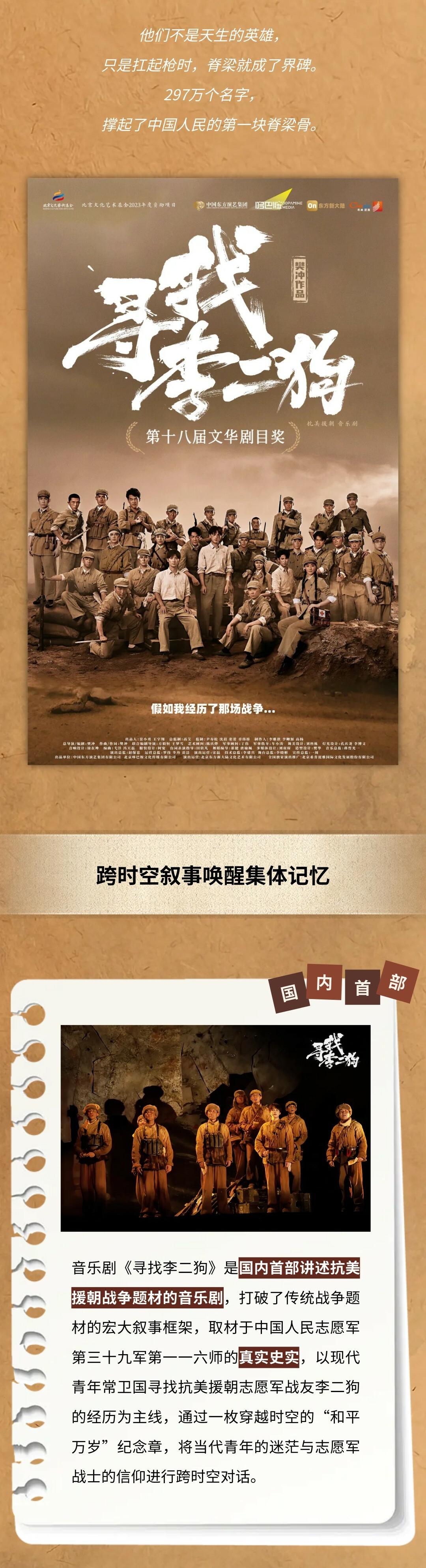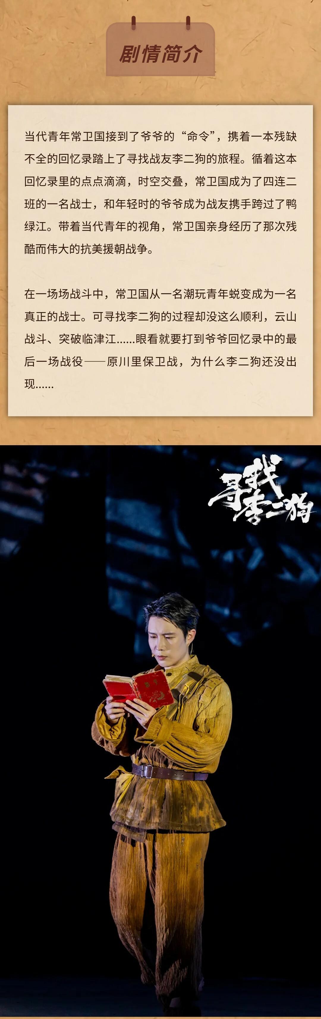 音乐剧《寻找李二狗》是国内首部讲述抗美援朝战争题材的音乐剧,打破了传统战争题材的宏大叙事框架,取材于中国人民志愿军第三十九军第一一六师的真实史实,以现代青年常卫国寻找抗美援朝志愿军战友李二狗的经历为主线,通过一枚穿越时空的"和平万岁"纪念章,将当代青年的迷茫与志愿军战士的信仰进行跨时空对话。