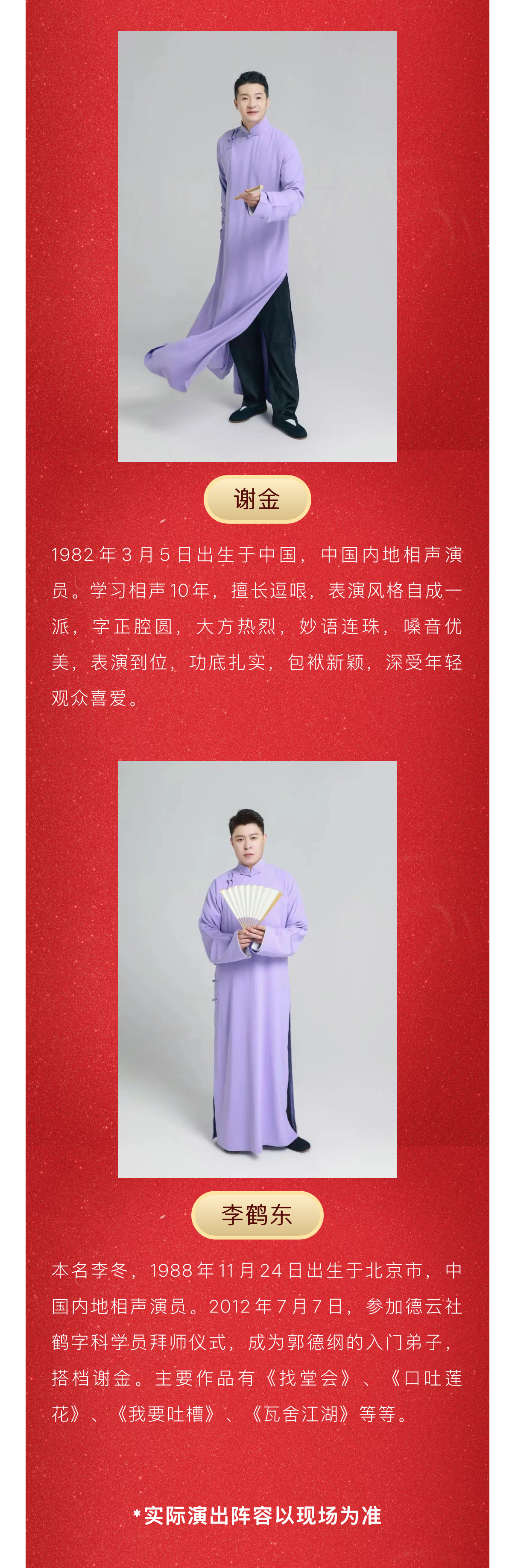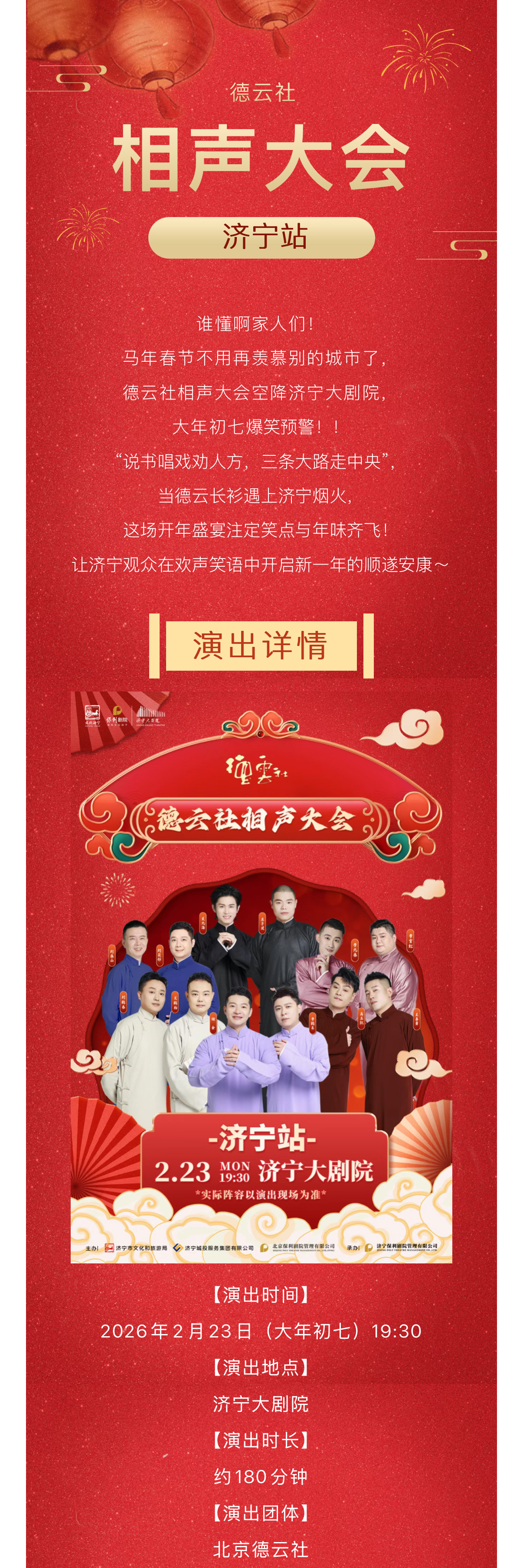 2026年2月23日,新春演出季——德云社相声大会专场演出走进济宁大剧院,十二位风格独具的相声演员齐聚一堂,为您烹制一道风味十足的笑料大餐!
