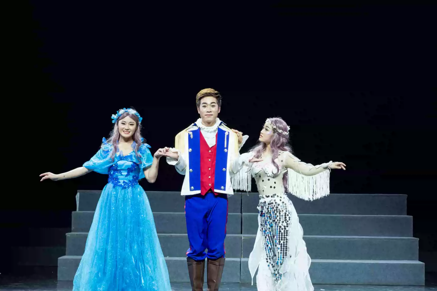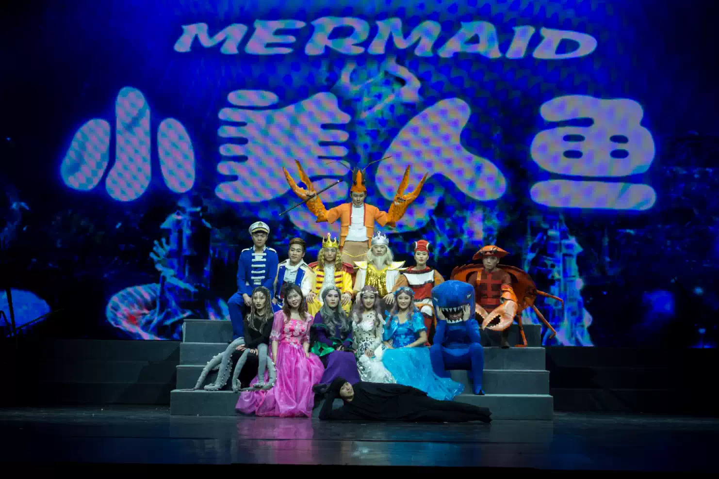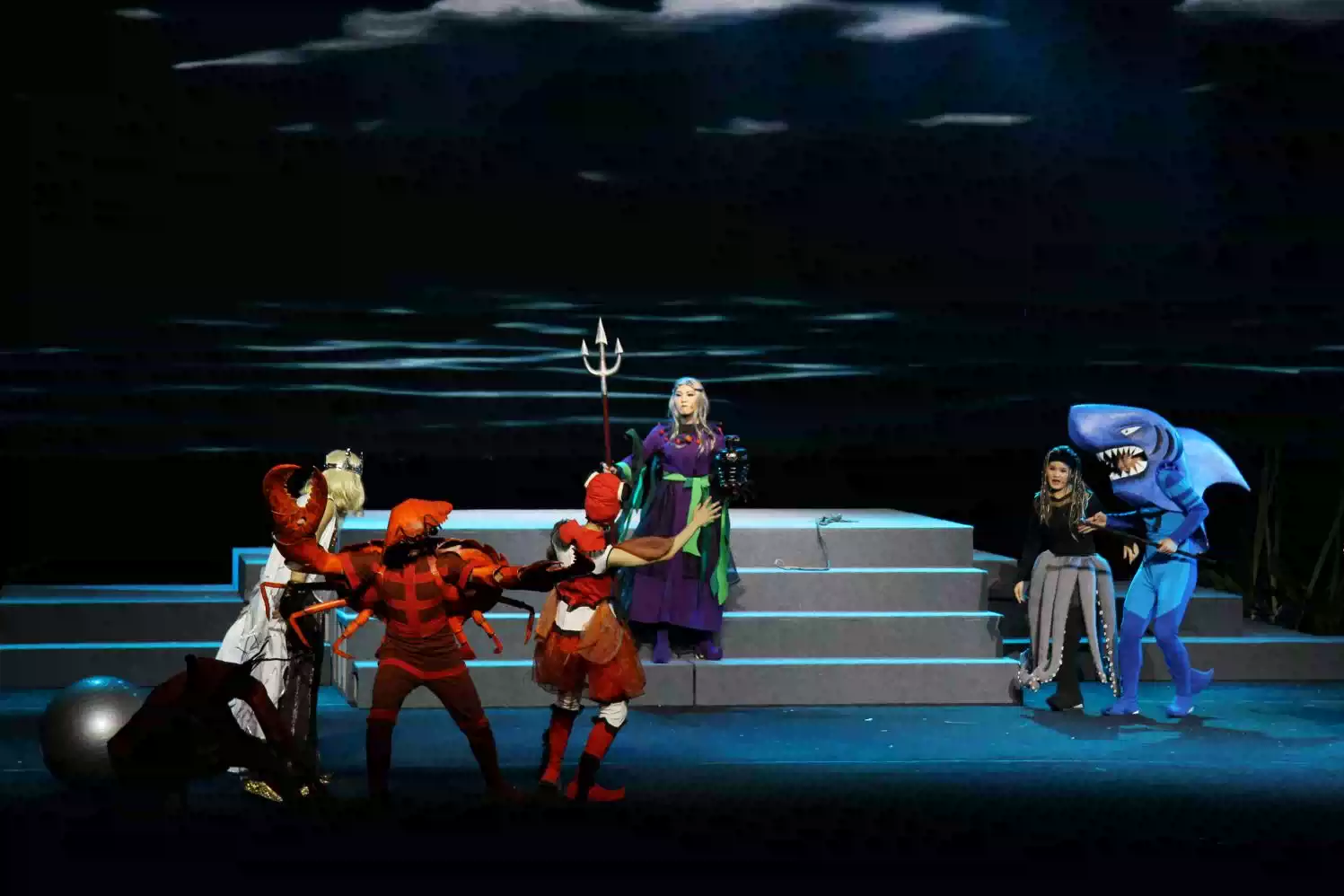 舞台上逼真呈现出神奇梦幻的海底世界,浩瀚的星空、光彩夺目的贝壳,精致的海底生物穿梭其中,让人身临其境在海底世界!