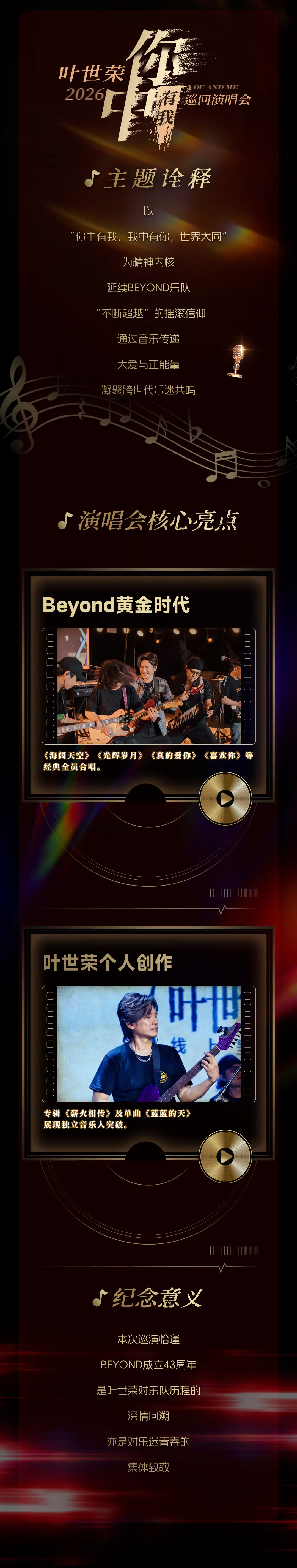 此次巡演恰逢BEYOND成立43周年,是叶世荣对乐队历程的深情回溯,亦是对乐迷青春的集体致敬!