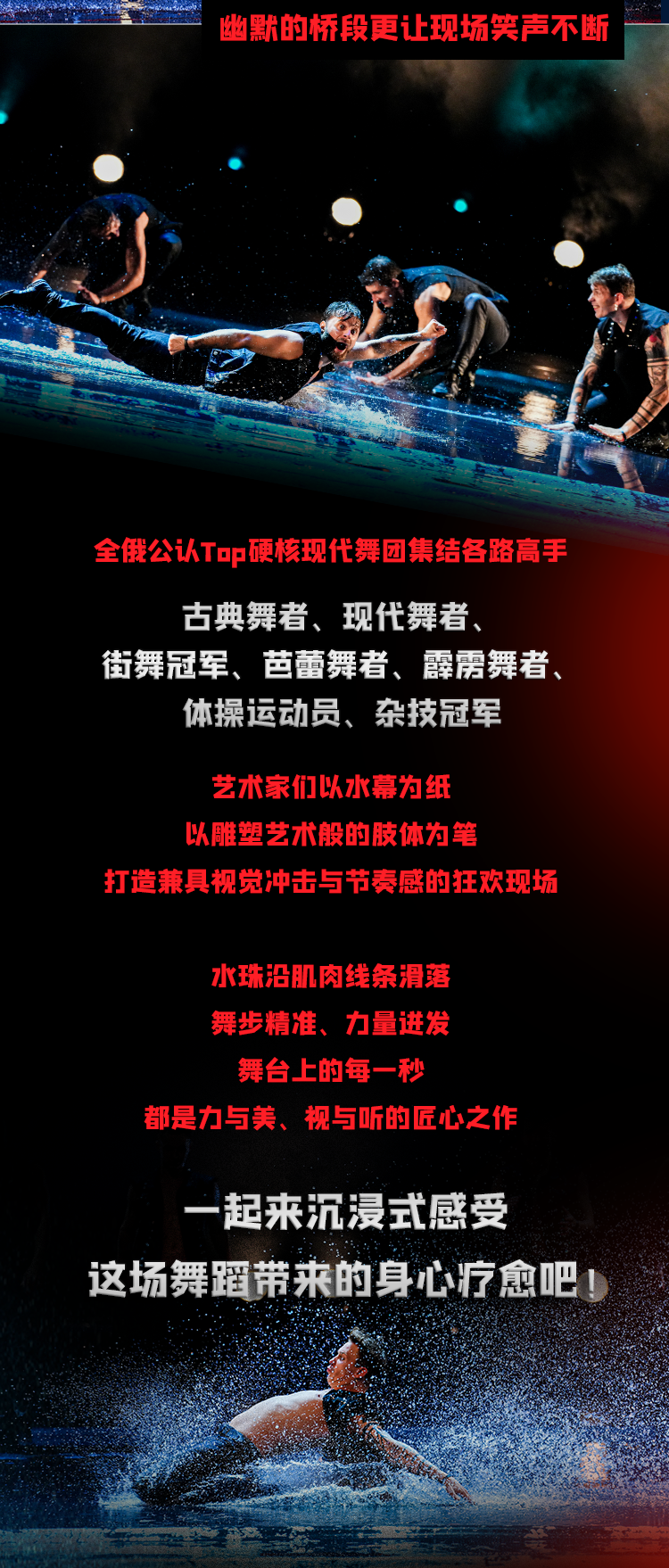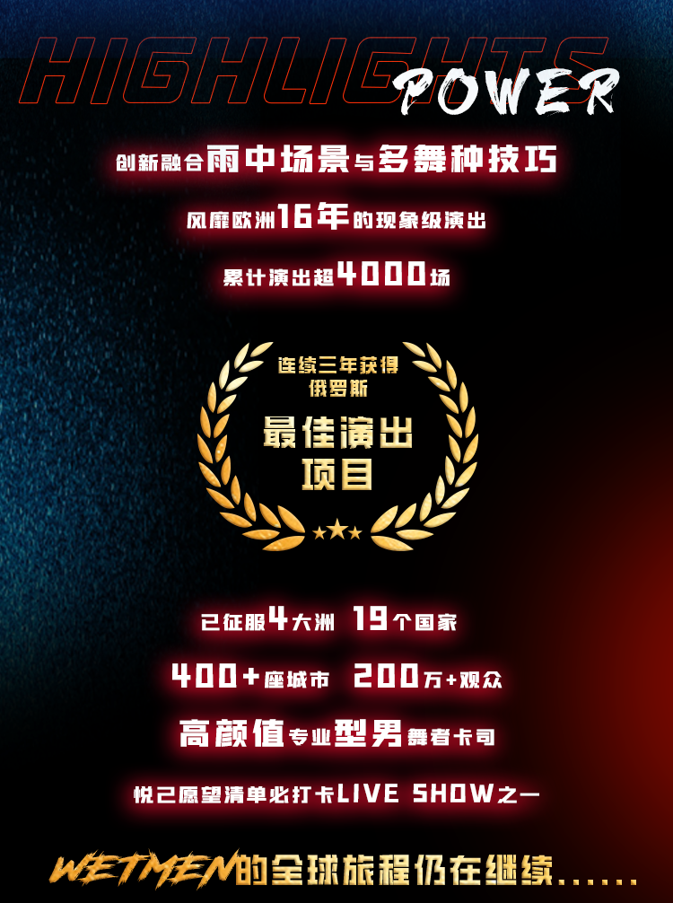 WetMen是全俄公认最硬核的现代舞团体之一。这支来自圣彼得堡的型男舞团集结了各路高手:古典舞舞者、现代舞冠军、街舞冠军、芭蕾舞者、霹雳舞者、体操运动员、杂技冠军、舞蹈真人秀选手……在演出的高潮部分,大雨在舞台上落下,型男艺术家们在飞溅的水花中完成高难度的舞蹈动作,富有表现力的编舞,大胆的技巧展示,专业舞者强大的能量和艺术创造力都会让观众们的尖叫声掀翻屋顶!
