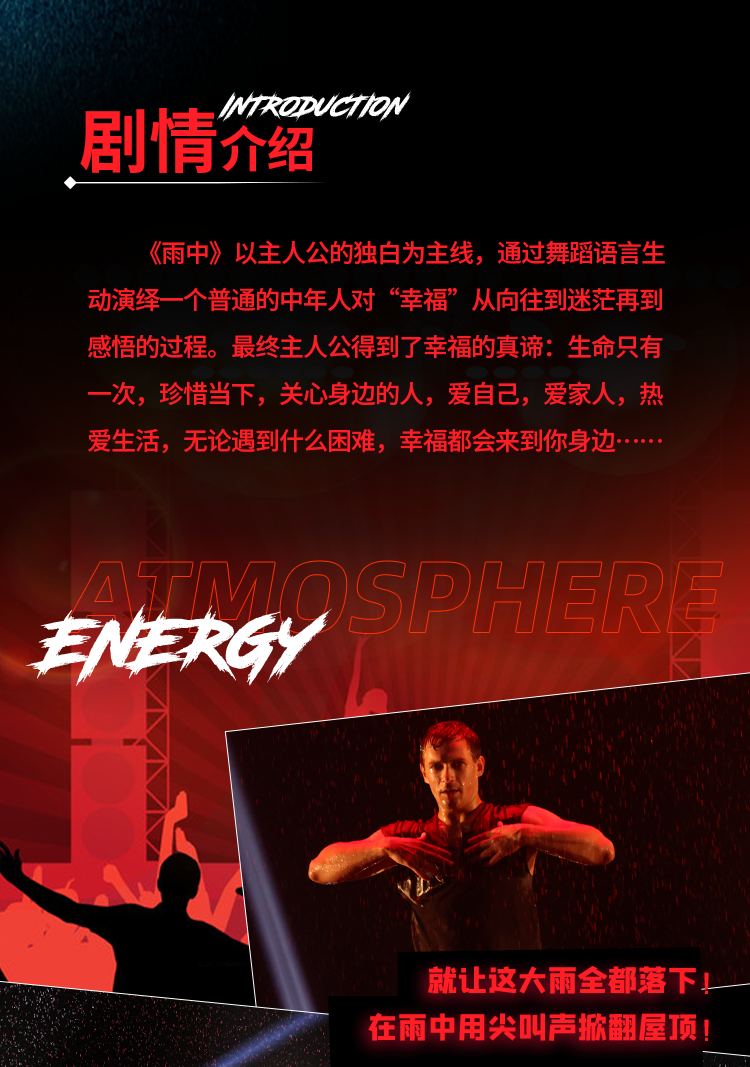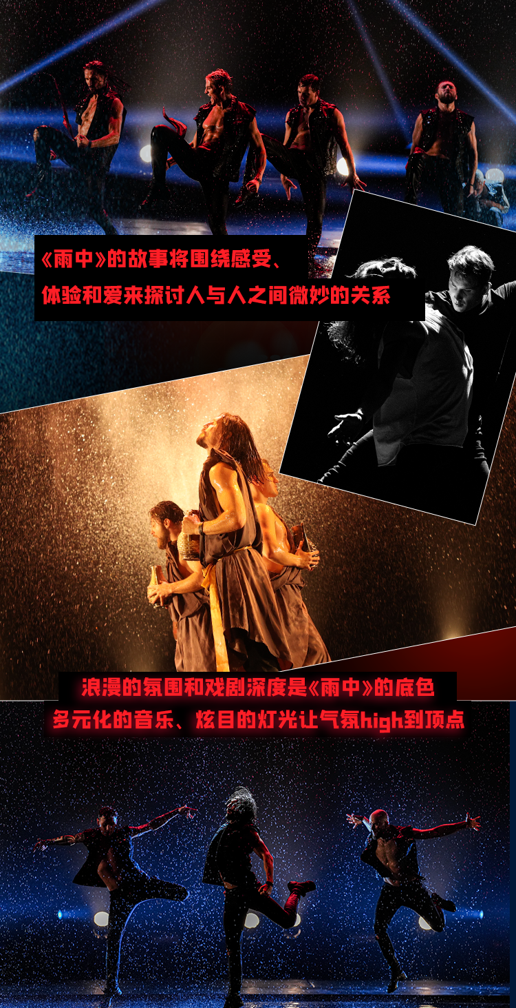 俄罗斯型男水舞剧《雨中》由俄罗斯五大编舞师之一——Rustam Nadyrshin于2009年创作并搬上舞台,演出历经多年打磨,期间多位资深编舞师的加入也为演出注入了新的灵感和活力。这台完全由型男硬汉出演的舞剧将真实的雨中场景与舞蹈进行恰如其分的结合并呈现在剧院舞台上,被誉为“圣彼得堡的骄傲”,在欧洲火爆上演16年,已成为欧洲现象级演出之一,更是连续三年被评为“俄罗斯最佳演出项目”。