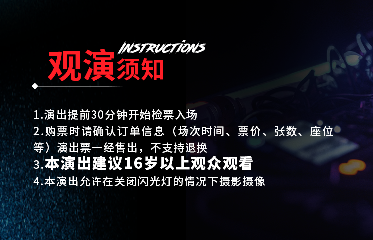 4.入场后,请严格按照票面指定区域和座位对号入座,请勿在演出期间换座,文明观演。