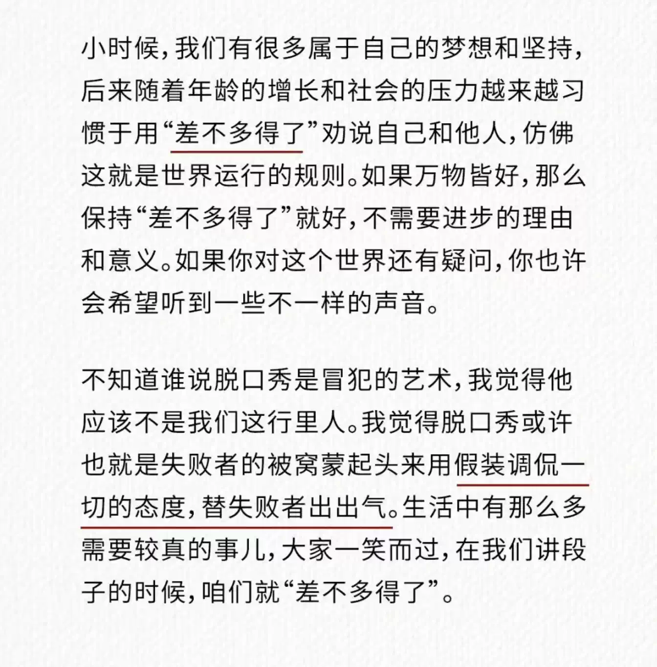 他说:“脱口秀是失败者的被窝,咱就假装调侃一切,替生活出出气!”