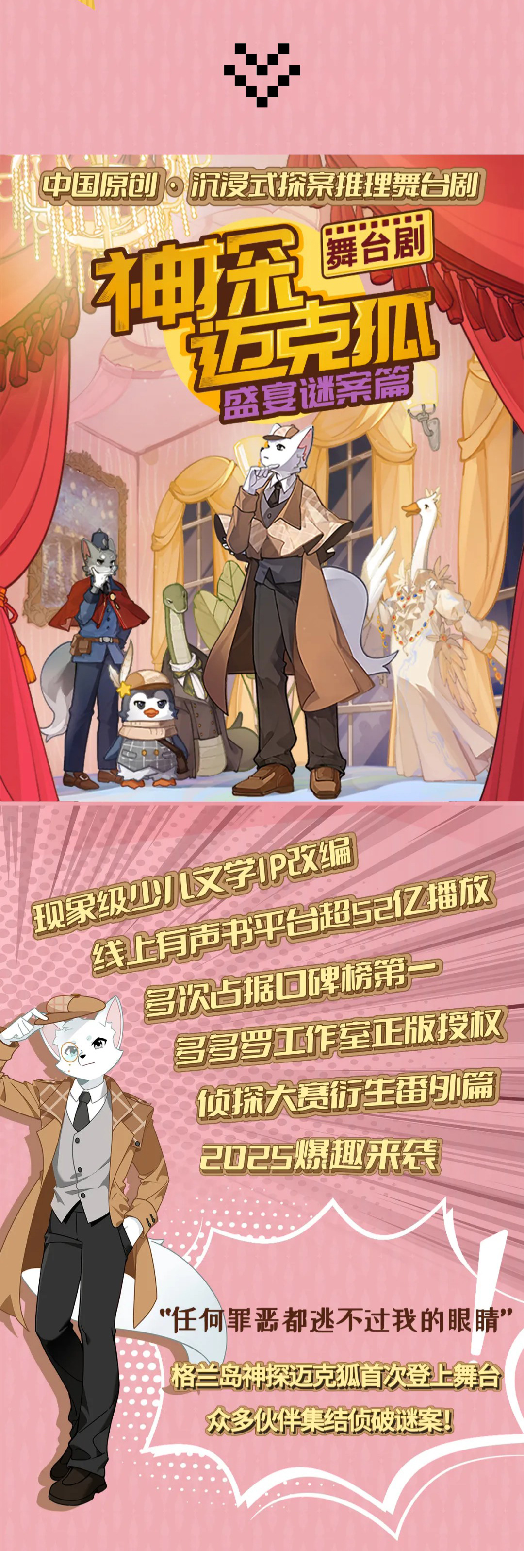 2026年3月15日,正版授权沉浸式推理舞台剧《神探迈克狐-盛宴谜案》走进常州大剧院,开启轻松欢快的亲子时光!
