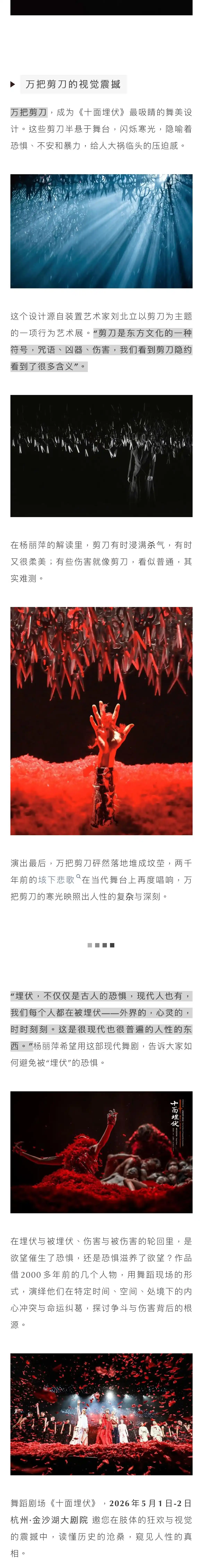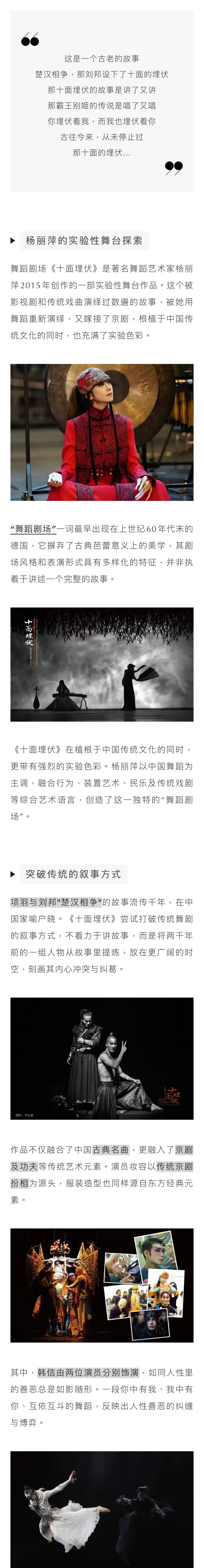 杨丽萍全新解读《十面埋伏》,从楚汉相争的经典叙事中提炼人物的极致冲突与情感纠葛,融古典雅韵、京剧腔调、功夫力道于一体匠心演绎!2026年5月1日-2日,邀你走进杭州金沙湖大剧院,沉浸式感受国风舞台的视觉震撼,我们不见不散!