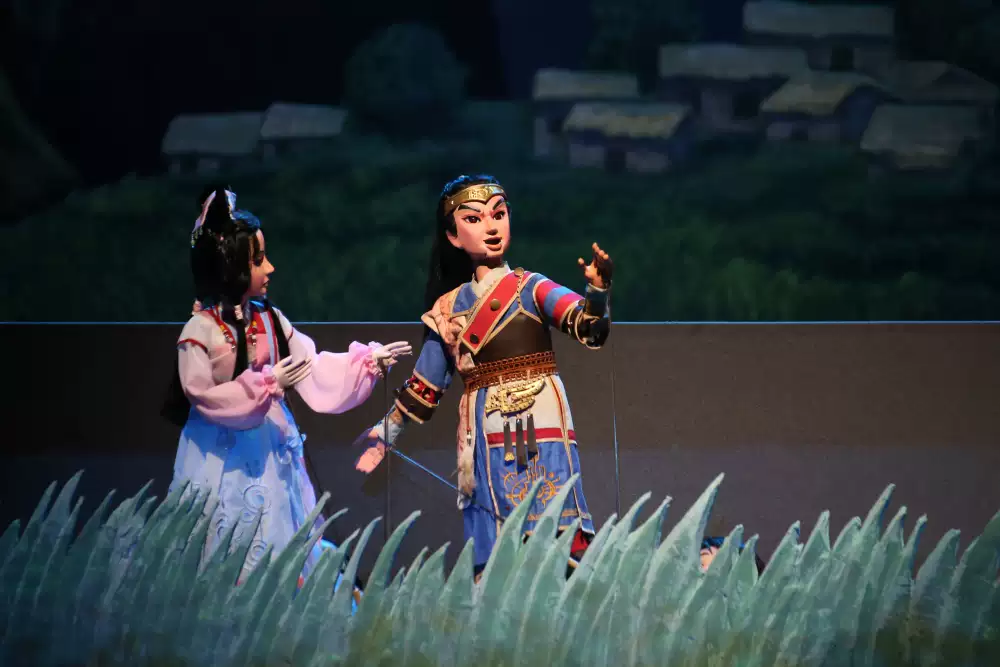 剧中,塑造了嫦娥、后羿、土地神、金乌、西王母、村民等多个木偶形象,他们都是由真人在舞台上的挡板后操纵演出,面对观众,活灵活现。