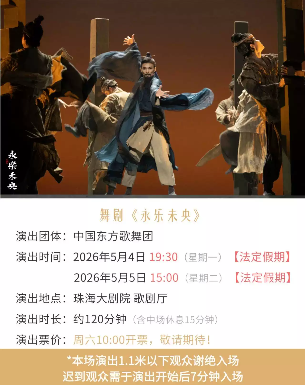 | 演出时长 | 以现场为准 | 儿童入场提示 | 1.1米以下儿童谢绝入场,1.1米以上观众凭票入场 |