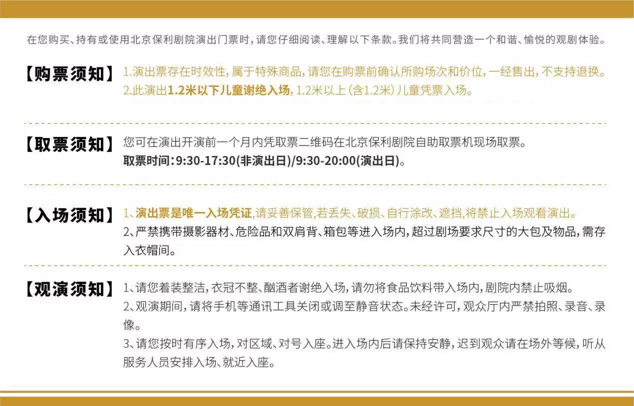1.购买前请您提前规划好行程,做好相应准备,以免影响您的正常观演,感谢您的理解和配合。
