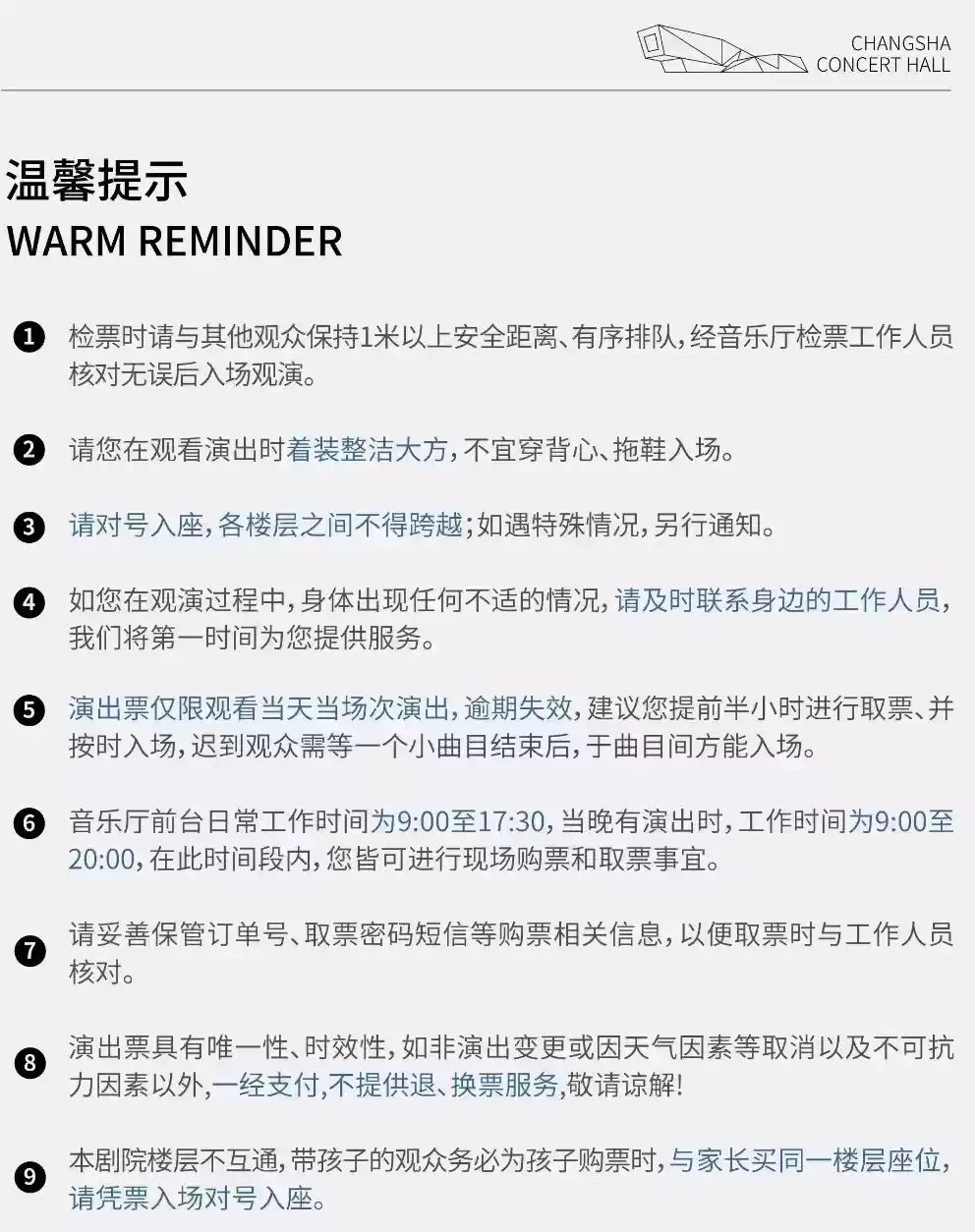 4.入场后,请严格按照票面指定区域和座位对号入座,请勿在演出期间换座,文明观演。