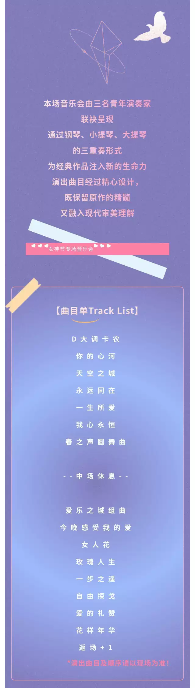 | 演出时长 | 以现场为准 | 儿童入场提示 | 儿童一律凭成人票入场 |