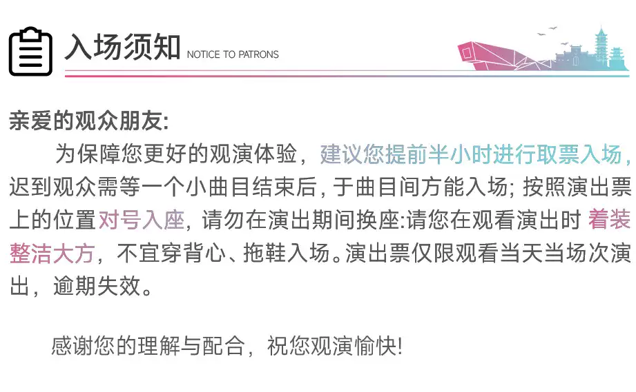 3.迟到观众需在场外等候,听从工作人员安排进场。请您合理安排出行时间,尽量提前抵达剧院,以免延误观演。